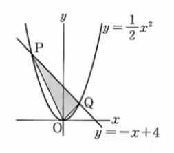 ① まずは交点を求める。\( \frac{1}{2}x^2 = -x + 4 \)